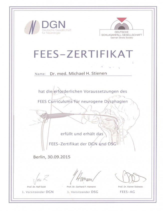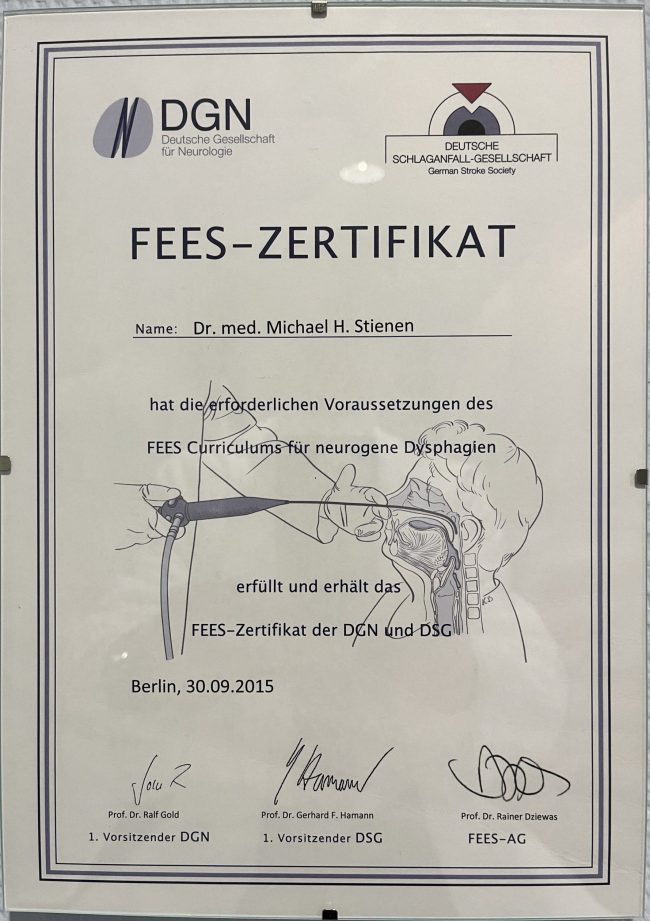 Für die zweijährige Fachtherapeuten-Fortbildung für Schluckstörungen von Logopäden/-innen am Kölner-Dysphagie-Zentrum referierte Dr. Stienen zuletzt am 15. November 2024.